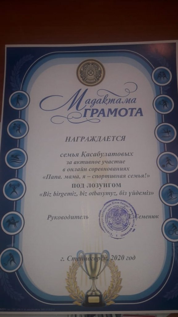Степногорск қаласының білім білімінің ұйымдастыруымен "Biz birgemiz, biz otbasymyz, біз үйдеміз" ұранымен "Әкем, анам, мен - спорттық отбасы" атты онлайн жарысына белсене қатысқаны үшін ата-ана Қасабұлатовтар отбасы мақтау қағазымен марапатталды.