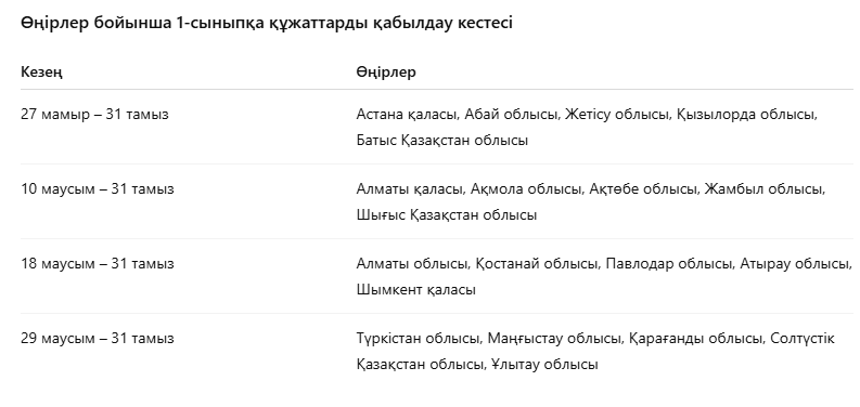 Өңірлер бойынша 1-сыныпқа құжаттарды қабылдау кестесі