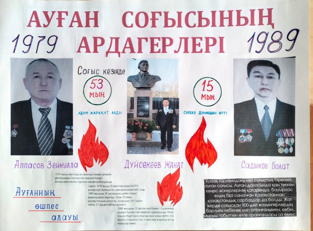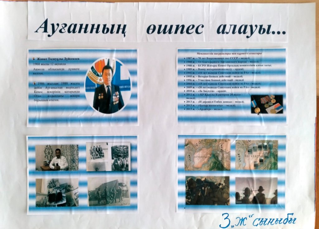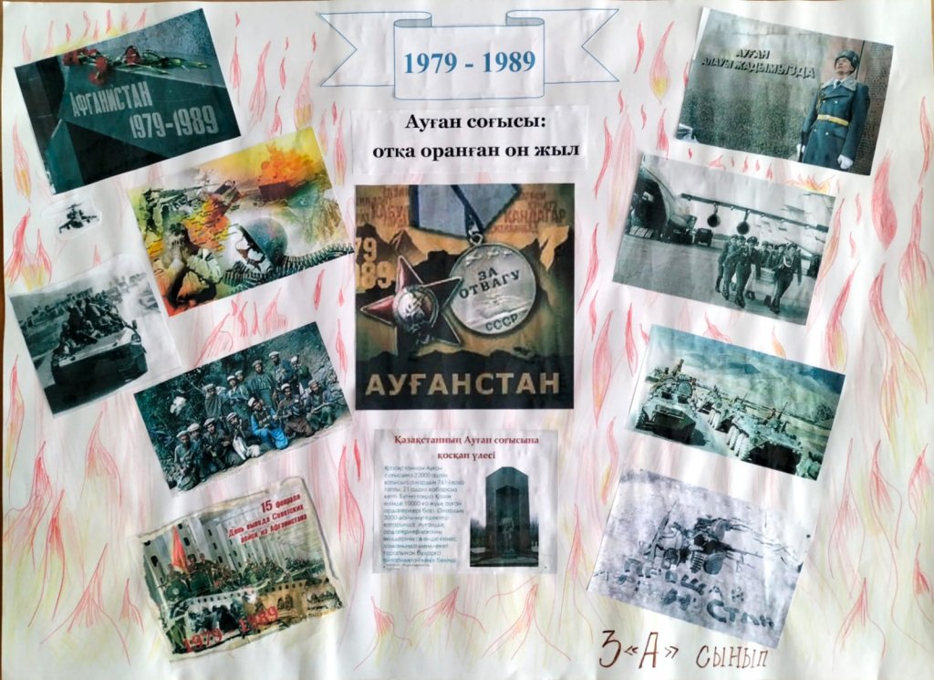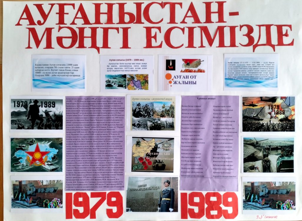 Биыл Кеңес әскерлерінің Ауғанстан жерінен шығарылғанына 33 жыл. Атаулы датаға орай 15 ақпан күні «Ауған жауынгерлеріне арналады» тақырыбында сурет көрмесі ұйымдастырылды. Көрмені 1-11 сынып оқушылары тамашалады