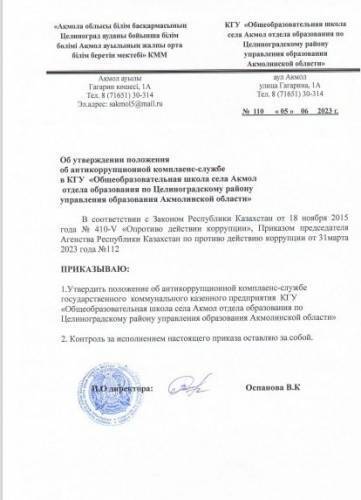 «Ақмола облысы білім баскармасының Целиноград ауданы бойынша білім бөлімі Ақмол ауылының жалпы орта білім беретін мектебі Коммуналдық мемлекеттік мекемесі» сыбайлас жемкорлыққа қарсы комплаенс-қызмет ережесін бекіту туралы